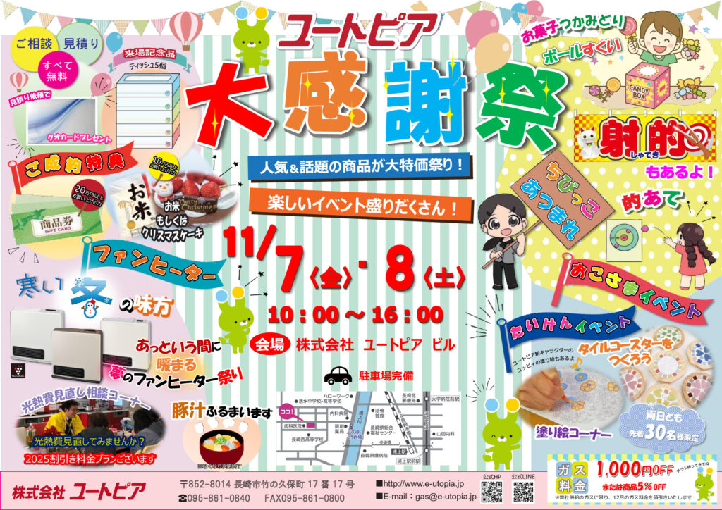 10月 15 utopia News, お知らせ ユートピア大感謝祭 11/7(金)8(土) ユートピア 年に一度の大感謝祭を開催します😊👏日頃の感謝を込めて、お得な商品や楽しい催しをご準備しています🎁ぜひお誘い合わせの上ご来場ください。スタッフ一同、心よりお待ちしております。期間:2025/11/7(金)8(土) 10:00~16:00 株式会社ユートピア〒852-8014長崎県長崎市竹の久保町17-17TEL:095-861-0840FAX:095-861-0800 Like