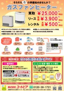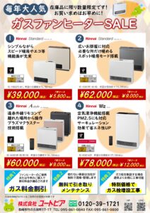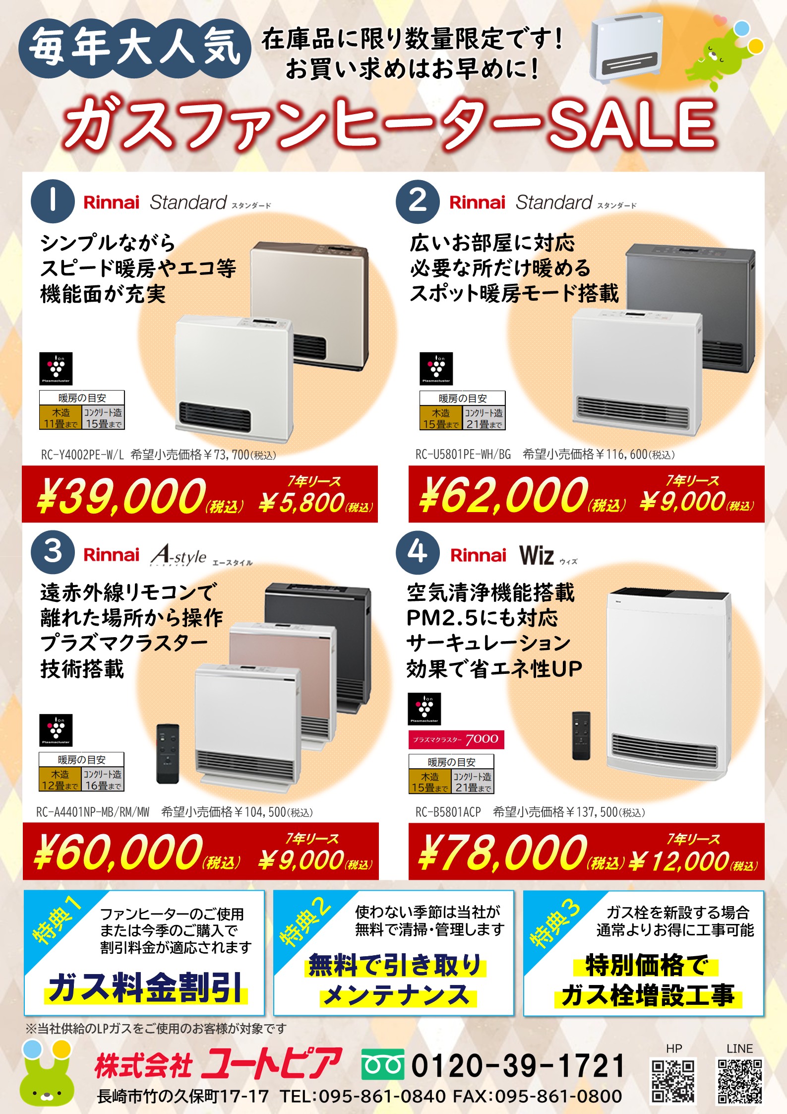 10月 22 utopia おすすめ商品, お知らせ ガスファンヒーターキャンペーン 今年もガスファンヒーターの季節がやってきました。毎年大人気のガスファンヒーターがお得なセール価格で販売中です!在庫限りの数量限定販売ですので、お買い求めはお早めに!今なら期間限定で割引料金プランをご準備しています。気になる方はお気軽にお問い合わせください。※当社LPガスをご使用のお客様が対象です 株式会社ユートピア〒852-8014長崎県長崎市竹の久保町17-17TEL:095-861-0840FAX:095-861-0800 Like