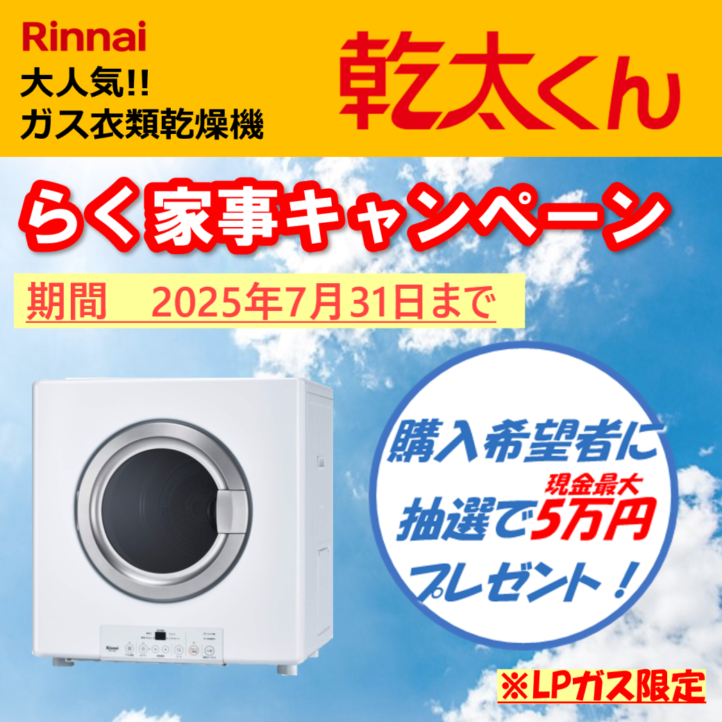 大人気のガス衣類乾燥機「乾太くん」をお得に購入できるチャンスです!長崎県LPガス協会のらく家事キャンペーンに応募すると抽選で現金3万円が当たりますさらに先着で50名様には+2万円(合計5万円)キャッシュバック応募用ハガキをご希望の方はお気軽にお申し付けください!※必ず乾太くんをご購入する前にご応募ください※応募期限 7/31(木)まで※キャンペーンは当社LPガスをご使用のお客様が対象です乾太くんを詳しく知るにはコチラ